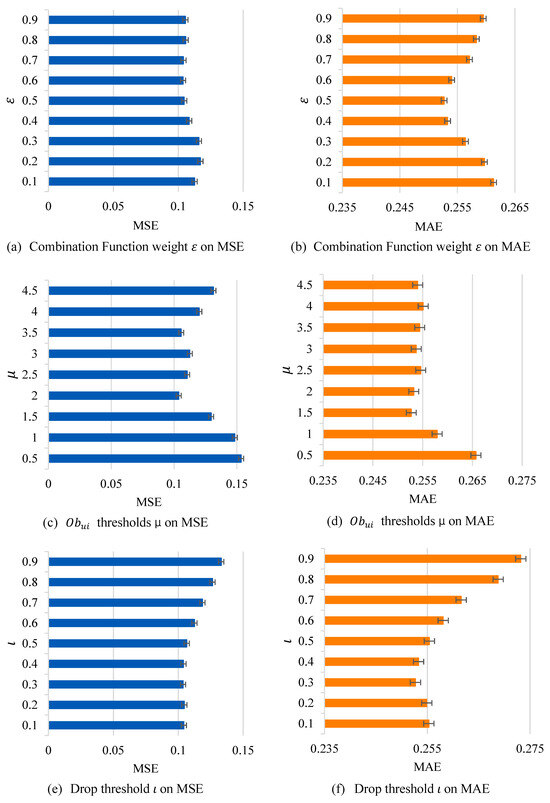 The more critical parameters are as follows: sentiment weight , discard threshold , and . The final results of the parameter analysis are shown in Figure 5.