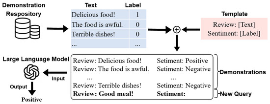 Then, a new query is presented, which is the target text the model needs to evaluate. In this case, the new query might be “Review: Good meal!” with the sentiment label still undetermined.