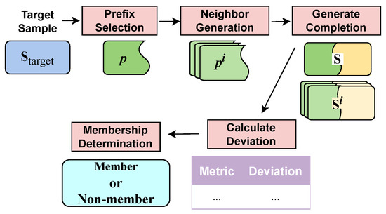 The method consists of four main steps: generation of the neighbor prefix, predictive completion, calculation of the metric deviation, and sample membership determination. These steps are detailed in Section 4.2, Section 4.3, Section 4.4 and Section 4.5. The detailed algorithm is provided in Algorithm 1. To make our method easier to understand, a flowchart capturing our algorithm process is shown in Figure 2.