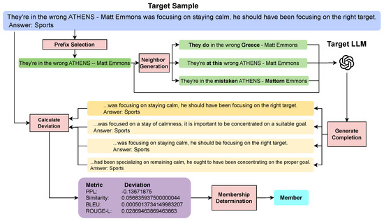 Our target sample is “They’re in the wrong ATHENS—Matt Emmons was focusing on staying calm, he should have been focusing on the right target. Answer: Sports”, and we extract the first 33% of the sample as its prefix, randomly replace two words in the prefix with their synonyms to generate a neighbor prefix. In the example, the original prefix is “They’re in the wrong ATHENS—Matt Emmons”, and the neighbor prefixes are “They do in the wrong Greece—Matt Emmons”, “They’re at this wrong ATHENS—Matt Emmons”, and “They’re in the mistaken ATHENS—Mattern Emmons”. Then, we input the original prefix and the neighbor prefix into the LLM loaded with the ICL example, where the loaded context example contains the target sample. The corresponding completions are “…was focusing on staying calm, he should have been focusing on the right target. Answer: Sports”, “…was focused on a stay of calmness, it is important to be concentrated on a suitable goal. Answer: Sports”, “…was focusing on staying calm, he should be focusing on the right target. Answer: Sports”, and “…had been specializing on remaining calm, he ought to have been concentrating on the proper goal. Answer: Sports”. We compute the metric deviation between the original sample and its completion using the defined formula, and feed the deviations into the attack model to determine whether the sample is a “Member”.