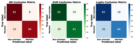 The confusion matrix of different attack models on DBPedia on LLaMA3 is shown in Figure 8. The results show that the Neighbor Deviation Attack using neural networks as the attack model has the highest true positive rate (TPR) and true negative rate (TNR), indicating that it can effectively distinguish between member and non-member samples. On the contrary, the SVM model has the lowest TPR and TNR, and the logistic regression model has a TPR and TNR that are slightly lower than those of the neural network model but higher than those of the SVM model. Therefore, this further supports our choice of neural networks as the attack model.