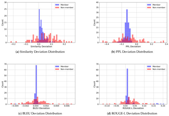 From Figure 9, we can observe the following. Overall, the metric deviations of member samples are more concentrated within a specific range compared to non-member samples, allowing us to distinguish between them. Specifically, the BLEU deviation and ROUGE-L deviation of member samples exhibit significantly higher concentrations than those of non-member samples, making these two metrics particularly effective for differentiation. While the similarity deviation and PPL deviation of member samples are less concentrated than the former two metrics, they still demonstrate substantial distinctions from non-member samples, thereby also serving as viable criteria for classification. This provides a reliable basis for our proposed method to distinguish between member and non-member samples.