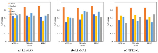 Comparison between single deviation threshold judgment and multi-dimensional metric deviation threshold judgment. The performance is measured in terms of Advantage. (a) The attack performance of single metric deviation judgment and Neighbor Deviation Attack across three datasets on LLaMA3. (b) The attack performance across the same datasets on LLaMA2. (c) The attack performance across the same datasets on GPT2-XL.