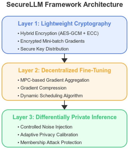 Below, we detail each of the three layers of SecureLLM, explaining each component’s conceptual underpinnings and technical contributions. While the layers are presented sequentially, in practice, they can be integrated and tuned together, creating a dynamic security ecosystem that is responsive to real-time performance and compliance needs. The integration of security layers. The three layers of SecureLLM are designed to work in unison: lightweight cryptography secures the data during transit, decentralized fine-tuning aggregates the encrypted gradients securely, and differential privacy at inference ensures that the final outputs are protected against membership inference. The system is engineered so that the overhead introduced by cryptographic operations is balanced by efficient MPC protocols, while the noise calibration in DP is tuned to maintain model utility. However, we are aware that stacking lightweight cryptography, fine-grained decentralization, and differential private inference has the potential for interaction effects that could influence the overall framework’s effectiveness. An example is that sequential stacking can accumulate latency, especially for apps with shared ephemeral key rotations and also with decentralization gradient aggregation. Additionally, the simultaneous use of differential privacy and cryptographic measures may result in compounded noise levels, potentially degrading the model’s accuracy beyond the acceptable thresholds. Furthermore, interactions between cryptographic protocols and MPC-based aggregation could inadvertently introduce unforeseen vulnerabilities—such as weakened randomness due to overlapping entropy sources or compromised key exchange protocols—that could negatively impact other security layers.