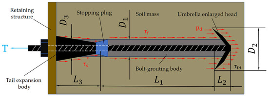 As an innovative anchorage structure, the enlarged head bolt has realized the technical breakthrough of the traditional bolt through its unique force transmission mechanism, which is defined as the “bearing-friction” composite bolt by the academic community [1]. The bearing capacity of the structural system is characterized by the synergistic effect of dual mechanical mechanisms: one is the end bearing resistance provided by the soil at the enlarged head section and the other is the bond friction resistance generated by the contact interface between the anchorage body and the stratum. The mechanical model is shown in Figure 1, where L1 is the anchorage section, L2 is the enlarged head section, and L3 is the expansive body section. Based on a large number of experimental studies and engineering practices, it is shown that the soil end bearing resistance plays a dominant role in the bearing capacity of the composite anchor. Therefore, how to effectively stimulate and make full use of the soil end bearing resistance at the variable cross-section of the enlarged head becomes the key technology to improve the uplift bearing performance of this kind of anchor. This mechanical property not only reflects the essential difference between the enlarged head bolt and the traditional bolt but also provides an important research basis for further optimizing the design theory of the umbrella-shaped enlarged-head hollow grouting bolt with expansion pipe.