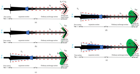 The failure process of the umbrella-shaped enlarged-head hollow grouting bolt with an expansion pipe (the failure of the soil around the enlarged head and the end of the expansion body) ((a) the static earth pressure stage, (b) the transitional stage 1, (c) the transitional stage 2, (d) the compaction stage 1, (e) the compaction stage 2).