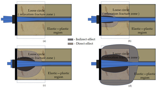 Figure 4 shows the effect of the influence range of the bolt expansion body section on the loose circle after extending into the borehole expansion. As shown in the figure, the length of the expansion body section is consistent with the radius of the loose circle section to ensure that the expansion body can fully cover the range of the loose circle. When the expansive body expands in the borehole, its radial pressure is transmitted to the surrounding rock mass, forming a uniform stress distribution, thus effectively reinforcing the broken rock mass in the loose circle. The expansion force of the expansive body not only enhances the friction between the bolt and the rock mass but also forms a stable reinforcement layer in the loose circle, which significantly inhibits the further crushing and deformation of the rock mass.