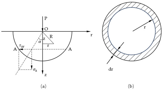 Boussinesq solution model of force and coordinate system ((a) The force and coordinate system of half space body, (b) Vertical equilibrium conditions).