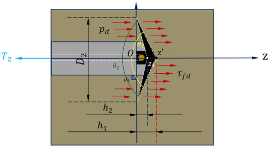 where taking the drawing force point as the coordinate origin, along the z-axis direction, a micro-element with a length of is taken at the distance from the origin to for analysis. In order to facilitate the calculation, the umbrella-shaped expansion head is simplified as a double cone (cone cap) for research, as shown in Figure 6. According to the equilibrium conditions of the infinitesimal body, the following relations can be obtained: