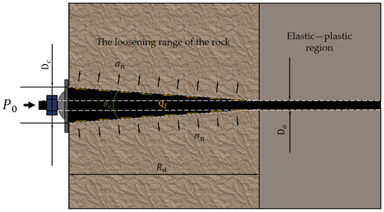After the excavation of the roadway, the original in situ stress is released, which causes the surrounding rock to enter the elastic–plastic stress redistribution state and form a loose circle. The boundary of the loose circle can be expressed by the radius of the loose circle. In practical work, the plate nut at the tail of the bolt is tightened to give a certain preload to the bolt, the expansion body is driven by the cone angle , and then the fastening pressure is applied to the surrounding rock and soil in the loose circle. The working principle is shown in Figure 7.