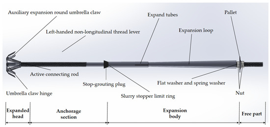 On a theoretical basis, the stress process analysis and pull-out bearing capacity research of an umbrella-shaped enlarged-head hollow grouting bolt with an expansion pipe is performed and the structure of an umbrella-shaped enlarged-head hollow grouting bolt with an expansion pipe is optimized. The overall design structure is shown in Figure 8. The whole umbrella-shaped expansion-head hollow anchor with an expansion pipe is composed of an anchoring section, an expansion section and a free section. The anchoring section includes the umbrella-shaped expansion-head anchoring section and the conventional anchor anchoring section. The conventional bolt anchorage section is the same as the conventional left-handed, non-longitudinal, rib thread steel. On the basis of high-strength thread steel, it is combined with a left-handed thread with excellent self-locking performance. After the anchorage body (grouting body) is solidified and formed, it can produce a good relaxation and self-locking function. With a slurry stopper at the tail of the conventional anchorage section, it can effectively prevent the leakage of the grouting fluid and accelerate the formation of the grouting body. The overall bolt adopts a hollow design. In the conventional support, after the grouting is injected from the tail of the bolt, the grouting fluid is transmitted to the umbrella-shaped expansion head of the bolt head through the entire bolt and then flows out from the slurry outlet of the umbrella-shaped expansion head. Under the action of the slurry stopper, the area between the entire anchorage section and the soil can be filled quickly and effectively. The free section at the end of the bolt is an unfixed section, which can absorb the variable situation energy of the soil or rock mass and play a role in buffering and regulating.