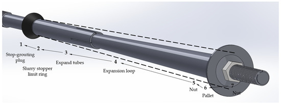 As one of the key research objects of this study, the expansion body section of the hollow grouting anchor with the umbrella-shaped expansion head with an expansion pipe plays an important role in improving the overall uplift resistance of the anchor. The spatial positioning of the expansion body section is between the slurry stopper and the pad, and its detailed structural composition is shown in Figure 10. The section is composed of multiple precision components, including an expansion ring, an expansion sleeve, a flat washer, a spring washer, a sleeve nut, a gasket, and a gasket nut. In practical engineering applications, the installation of each component follows a specific order: first the slurry stopper and its limit ring are installed, then the expansion ring is installed, followed by the expansion sleeve, flat washer, spring washer, sleeve nut, gasket, and finally the gasket nut. In order to monitor the stress state of the bolt in real time, a bolt dynamometer can be installed between the plate and the plate nut, so as to realize the accurate measurement of the working load.
