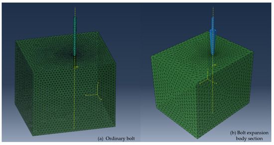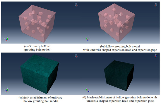 Based on the mechanical parameters of surrounding rock soil obtained by field drill sampling, numerical models of ordinary hollow grouting anchors and umbrella-shaped expanded-head hollow grouting anchors with expansion pipes were established in this study. Figure 11 shows in detail the geometric model construction and meshing scheme of the two anchors, in which the soil material parameters are determined according to the indoor test results of field sampling.