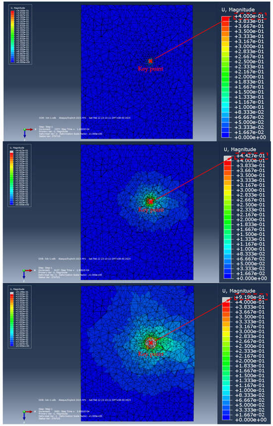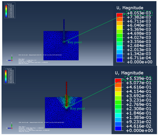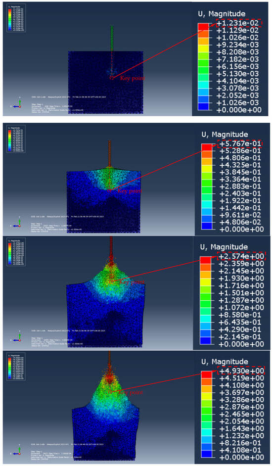 The displacement cloud diagram of the soil during the extension of the ordinary anchor into the soil (top view) (the size of the soil model is 2m × 1.5m × 1.5m.).