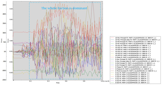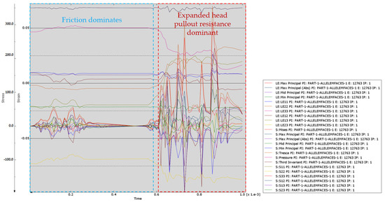 The numerical simulation results of the pull-out of the anchorage section of the umbrella-shaped expansion head are shown in Figure 12, Figure 13 and Figure 14. Specifically, Figure 12 shows the stress distribution evolution law of the anchorage section during the drawing process; Figure 13 reflects the displacement development characteristics of the anchorage section under the action of drawing; Figure 14 shows the stress–strain relationship curve of the anchorage section during the whole drawing process, which provides an important basis for analyzing its mechanical properties.