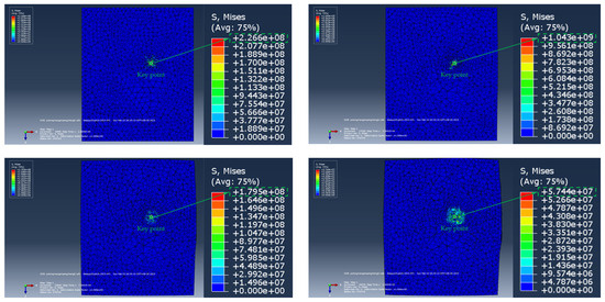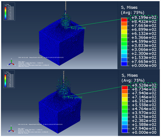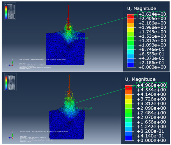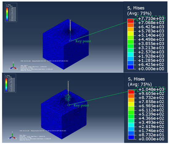 Figure 22 and Figure 23, respectively, show the stress distribution cloud map and the displacement distribution cloud map of the soil (surrounding rock) during the process of the ordinary anchor rod extending into the soil (surrounding rock). Through the stress cloud diagram, the stress concentration area and distribution characteristics of the soil around the ordinary anchor can be clearly observed, and the displacement cloud diagram intuitively reflects the deformation of the soil under the action of the ordinary anchor, including the size and direction of the displacement.