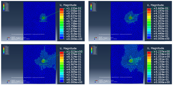 The soil displacement cloud diagram in the process of the expansion body extending into the soil (top view) (the size of the soil model is 2 m × 1.5 m × 1.5 m).