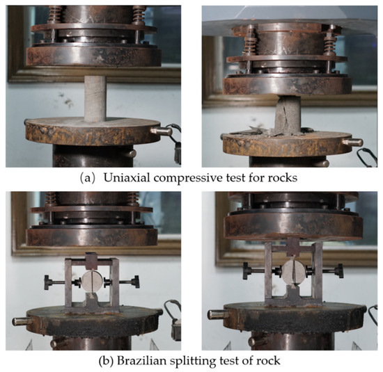 The determination of mechanical parameters is obtained from the core test taken from the site [44], and a part of the core is cut into cylindrical samples, one with a height of 100 mm and a diameter of 50 mm and one with a height of 20 and a diameter of 50. The core taken from each borehole is used to prepare 5 samples, with a total of four groups of 20 samples. The uniaxial compression test and Brazilian splitting are carried out on the samples, as shown in Figure 25.