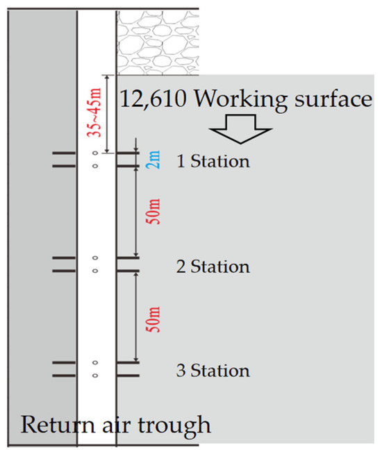 Based on the field measured data of the 12,610 working face of the Hongshiyan Coal Mine in Huangling County, Yan’an City, Shaanxi Province (Figure 26), the range of loose circles was accurately measured by a CLC1000-Z ultrasonic surrounding rock crack detector. The measurement results are shown in Figure 27 and are used as parameters for numerical simulation analysis. The results of the loose circle measurement show that the radius of loose circles in Hongshiyan 12,610 working face is in the range of 0.6 m to 1.5 m, which can provide a reasonable reference for the design of an expansive body section.