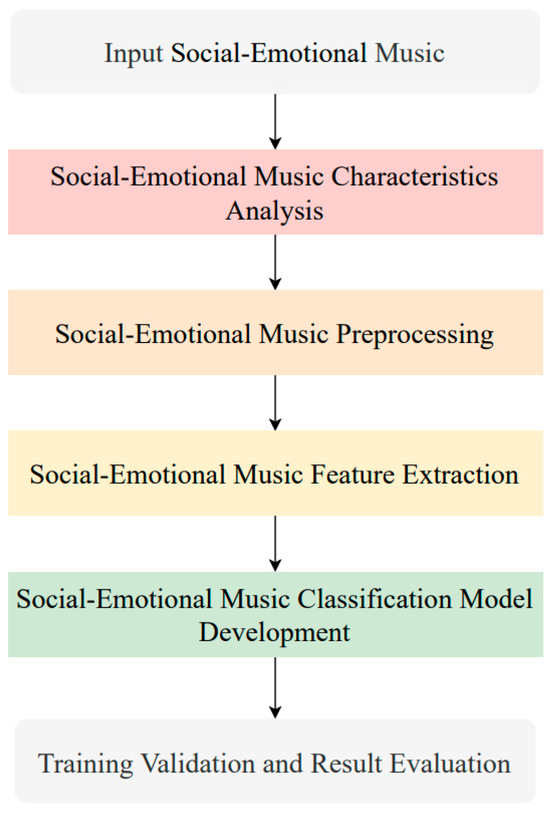This section is divided into four subsections. The first subsection describes the three types of social–emotional music studied in this research and outlines the extraction of three corresponding musical features. The second subsection focuses on multi-feature fusion through spectral characteristics to enhance the accuracy of CNN training for the three music categories. The third subsection extracts the features of the music after preprocessing. The fourth subsection evaluates and validates the training results using the proposed music emotion classification model. Figure 1 illustrates the overall methodology, comprising four main stages: data processing, feature extraction, model training, and performance evaluation.