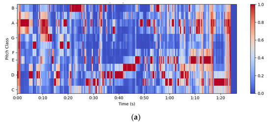 Chroma is a feature representation method used to describe pitch distribution by mapping pitch information from an audio signal into 12 semitone classes (C, C#, D, D#, E, F, F#, G, G#, A, A#, B) without considering absolute frequency or octave position. In other words, C4 (middle C) and C5 (high C) are mapped to the same Chroma class C. Chroma features effectively capture harmonic structures and tonal variations, making them widely used in music analysis and classification. Chroma features are utilized to analyze different categories of emotionally perceived music. Figure 2a depicts empathetic perspective-taking, where pitch energy is evenly distributed across the twelve semitone classes with relatively smooth variations, indicating a stable tonal structure and high melodic continuity. Figure 2b represents outlook, which exhibits a broader range of pitch variations and frequent key transitions, suggesting a more open melodic structure and greater musical flexibility. Figure 2c illustrates problem-solving, where specific pitch energy peaks are more prominent, indicating stronger contrast in harmonic composition and tonal transitions, which may be associated with greater emotional complexity and dynamic changes.