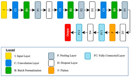 The detailed SEM-Net architecture is shown in Figure 4. SEM-Net receives a one-channel two-dimension input, and the input layer is denoted as I, followed by three blocks of convolutional layers: C1, C2, and C3, each with a kernel size of 5 × 5 and ReLU activation function. Each convolutional layer is followed by a batch normalization layer (B1–B3), a pooling layer (P1–P3) using 2 × 2 max-pooling, and dropout layers (D1–D3) with increasing dropout rates (0.25, 0.3, and 0.35) to prevent overfitting. After the final convolutional block, the feature maps are flattened (F) and passed through two fully connected (FC) layers. The first FC layer is dense with 256 units, followed by dropout (D4) with a rate of 0.4. The FC2 layer uses the softmax activation function to output probability scores across target music classes.