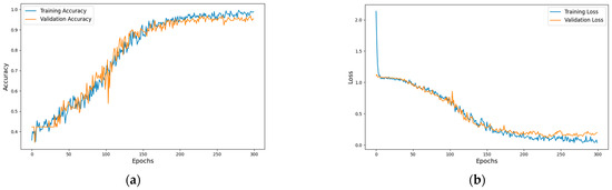 Social–emotional CNN training process in 300 epochs. (a) SEM-Net accuracy training process. (b) SEM-Net loss function training process.