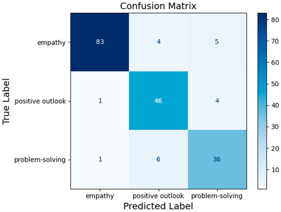Table 8 presents the classification results for three types of social–emotional music. The model performed best on empathic perspective-taking, with an accuracy of 91.94% and mAP of 97.76%, followed by outlook and problem-solving, achieving accuracy above 90% and mAP over 95%. These results show that the model can effectively distinguish between different types of social–emotional music. While the performance in the others category was slightly lower, it still maintained reasonable accuracy, indicating the model’s general classification ability.