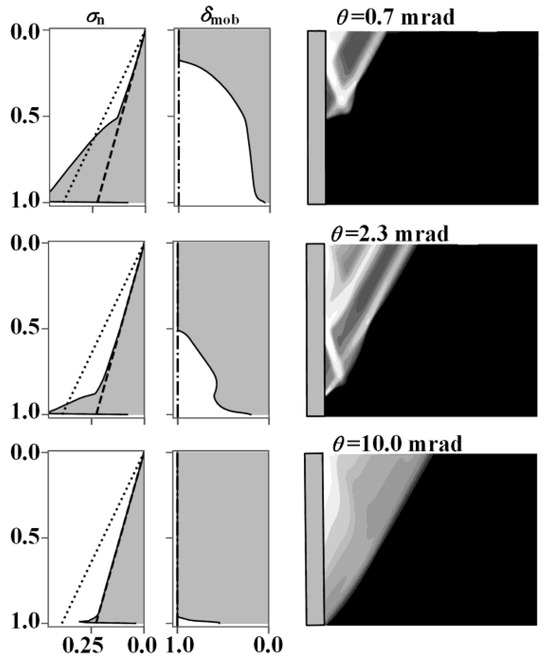 As shown in Figure 2, soil failure is observed to reach a depth of approximately y = 0.4, while interfacial failure between the wall and soil occurs only within the range from the soil surface to y = 0.2 when the rotating angle is 0.7 mrad. This phenomenon correlates with the distribution of earth pressure: within the range y ∈ [0,0.2], the active earth pressure state is achieved. In the deeper range y ∈ [0.2,0.5], the earth pressure remains slightly higher than the active earth pressure value.