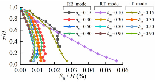 As illustrated in Figure 3, based on PLAXIS finite element numerical simulations, the critical horizontal displacement corresponding to the wall–soil interface friction angle reaching its ultimate state was extracted. The results demonstrate that when the friction angle between the retaining wall and soil attains its maximum value δm, the critical horizontal displacement Sδ required to reach the ultimate friction angle exhibits an approximately linear relationship with depth z, observed consistently under RB, RT, and T modes. Consequently, an expression for the mobilized friction angle at varying depths under non-limit states is proposed: