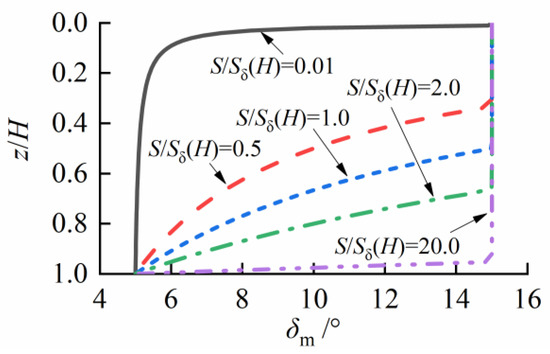 According to Equation (2), by selecting δ0 = 5°, δ = 15°, Sδ(z) = 0.1% z, the mobilized friction angle between the wall and soil under RB mode is illustrated in Figure 4 when horizontal displacements at the top of the retaining wall reach different values.