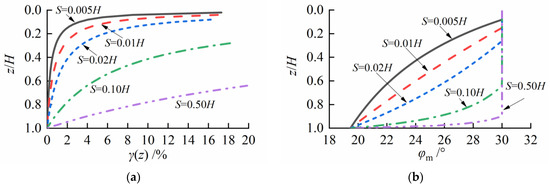 Using the corresponding shear strain γm from Figure 6a, the strain ratio η between the non-limit active state and the limit state can be calculated. Substituting K0 (the initial stress ratio, i.e., the coefficient of earth pressure at rest) into Equation (7), the distribution of the mobilized internal friction angle of the soil is obtained, as shown in Figure 6b.