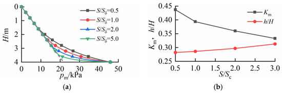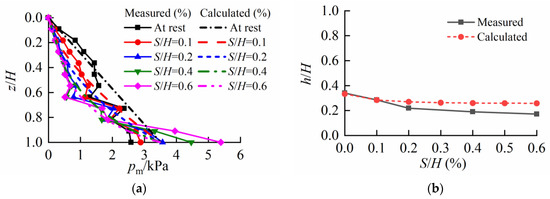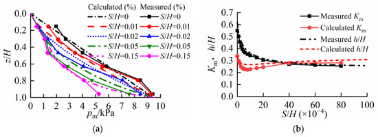 The relationships between the ratio h/H (the distance from the wall base to the horizontal earth pressure resultant force’s acting point relative to the wall height), the horizontal earth pressure coefficient Km, and the relative horizontal displacement S/H (or wall rotation angle) are illustrated in Figure 9b. Figure 9b shows that the calculated and measured values of h/H and Km agree well and follow consistent trends. The calculated relative position h/H of the resultant force aligns closely with experimental data. As the horizontal displacement at the wall top increases, h/H decreases gradually from an initial value of 1/3 (corresponding to the at-rest earth pressure state). This occurs because, under small displacements, the reduction rate of earth pressure in the upper wall section exceeds that in the lower section, shifting the resultant force downward. With further displacement, the upper soil reaches the active earth pressure state and ceases to decrease, while pressure near the wall base diminishes slowly. Only the mid-section continues to decrease, causing the resultant force to gradually rise. Ultimately, when the soil reaches the fully active limit state with linear pressure distribution, the resultant force returns to the 1/3 wall height position.