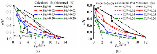 Figure 11a,b compare the experimental and calculated distributions of the maximum horizontal dynamic earth pressure and minimum horizontal dynamic earth pressure, respectively, under the RB displacement mode at different wall displacements.
