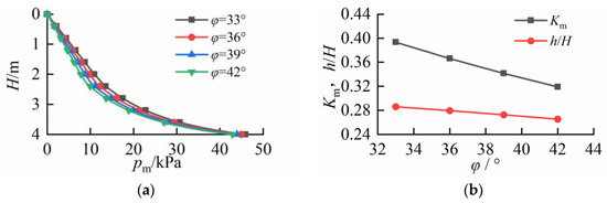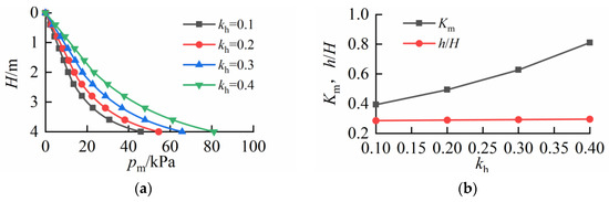 When kh = 0 and the soil reaches the active limit state, the lateral pressure coefficient km calculated from Equation (13) equals the Coulomb active earth pressure coefficient. Consequently, the active earth pressure distribution reduces to the triangular Coulomb active earth pressure distribution.