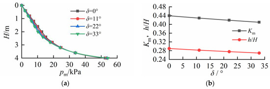 Calculation parameters: H = 4.0 m, γ = 17.6 kN/m3, φ = 33°, φ0 = 11°, δ0 = 0°, kh = 0.1, fa = 1.1, Rf = 0.85, and S/Sδ = 1.0. The soil–wall friction angle δ varies, and may be 0°, 11°, 22°, or 33°. The calculated earth pressure distributions are shown in Figure 13a, and the influence of the soil–wall interface friction angle δ on the active earth pressure coefficient and resultant force position is illustrated in Figure 13b.