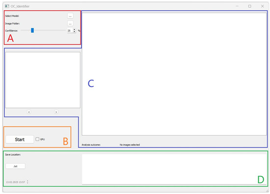 User interface of the OC_Identifier after starting the software. Area (A): Selection and Settings, Area (B): Starting the Test and Progress Status, Area (C): Graphical Display and Navigation, and Area (D): Results of Cell Classification.