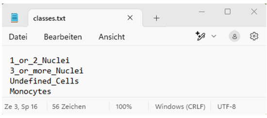 Area C is the visualisation area that allows the user to intuitively understand how the AI processed the images. The numerical evaluation is also based on the cells of the four classes marked in the images. These classes ranging from 0 to 3 are, namely, (0) 1_or_2_Nuclei, (1) 3_or_more_Nuclei, (2) Monocytes, and (3) Undefined Cells (Figure 3).