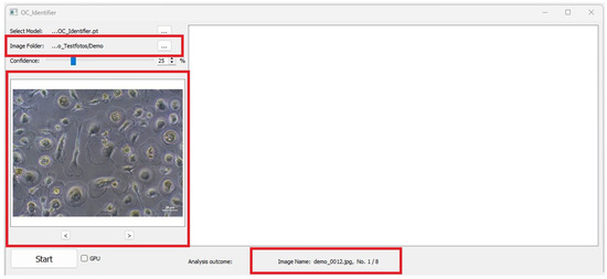 The two arrows below the preview image (‘<’ and ‘>’, Figure 4) can be used to scroll through the original images and the images evaluated by the AI simultaneously. This makes it possible to navigate between the images in the folder and to subjectively evaluate the dependence of the AI cell identification on the image quality (exposure, contrast, cell density, etc.). Text information containing details about the image (e.g., file name, metadata) appears below the large image window. When changing the image, the text information is automatically updated.
