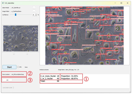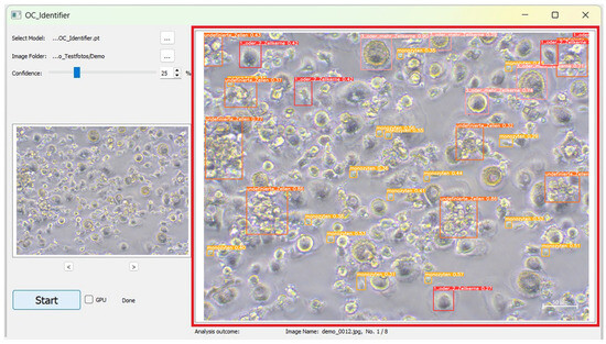 The software was developed with YOLOv5 [10] and PyQt [11] (Ultralytics, YOLOv5, Riverbank Computing, PyQt, 2022) and created as an executable file (OC_Identifier_EN.exe of the Max Bergman Center for Biomaterials, YOLOv5 EXE version 1.0.0, 2025, https://opara.zih.tu-dresden.de/handle/123456789/1247, Release date 29 January 2025 and accessed on 11 March 2025). Python was used for deep learning and the GUI application [12,13]. The software provided includes a pre-trained AI model named Demo_OC_Identifier.pt, which can be used directly for osteoclast identification. The AI training process is described elsewhere [1] and summarised here briefly.