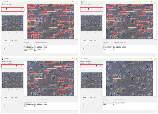 The following instruction for handling should be followed: if the number of correctly detected cells is too low, the confidence threshold should be lowered to increase sensitivity and reduce false negatives. If, on the other hand, the same cell is detected by several boundaries (boxes) of different classes, it is recommended that the threshold is raised in order to improve the specificity of the classification and to avoid overlapping detections. After starting the software and loading the image, the confidence threshold is adjusted using the slider. Moving the slider to the left lowers the threshold and causes more cells to be detected, but this can increase the number of false positives. Moving the slider to the right raises the confidence threshold, reducing the number of false positives but increasing the risk that some cells will not be detected. The effects of different confidence values are illustrated in Figure 7 by comparing different settings (1%, 25%, 80% and 90%).