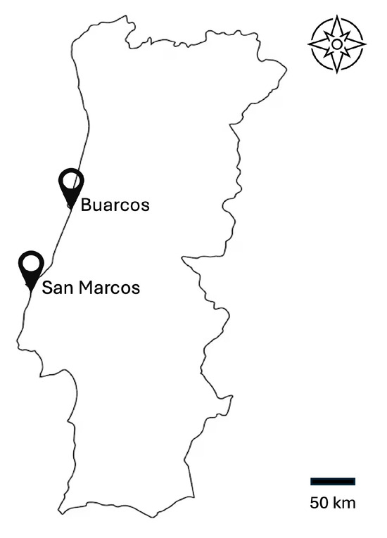 Location of Buarcos and San Marcos beaches in central Portugal.