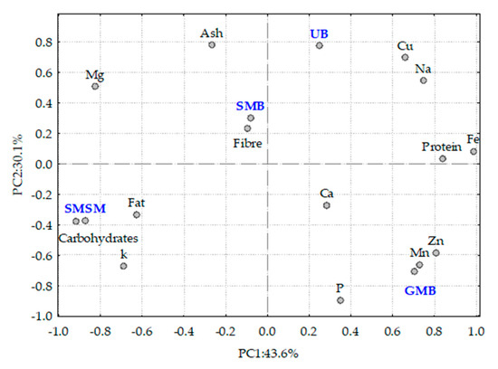 The PCA biplot in Figure 3, with two principal components (PC1 and PC2), accounts for 73.7 per cent of the total variance observed. The distribution of the samples in the PCA plot suggests a distinct differentiation of nutrients among the samples. Principal component 1 (PC1) shows a positive correlation with protein, Cu, Na, and Fe and a negative correlation with carbohydrates, fat, and K. In contrast, principal component 2 (PC2) is positively correlated with ash, fibre, and Mg and negatively correlated with P, Zn, Ca, and Mn.