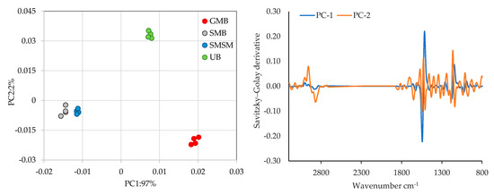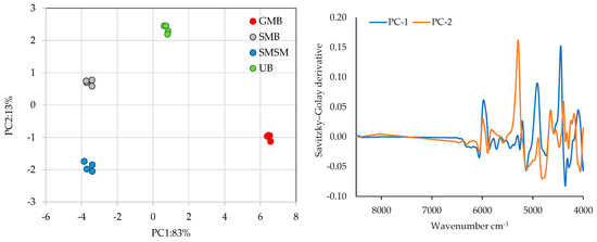 For PCA with spectral data, various mathematical transformation techniques were applied, including standard normal variate transformation (SNV), multiplicative scatter correction (MSC), Savitzky–Golay first and second derivatives, and combinations of these methods. The analysis of the spectra was performed using Unscrambler® X software, version 10.5.46461.632 (CAMO Software AS, Oslo, Norway).