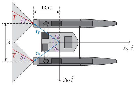 where and are the unit vectors in and directions, respectively. and are the port and starboard moment arms, respectively. LCG is the longitudinal center of gravity, B is the width of the vessel, r is the distance from the center of gravity to the thrusters, is the acute angle formed with , , and , and .