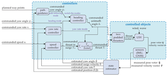 As shown in Figure 3, the USV motion control system consists of three parts: the controllers, the controlled objects, and the state estimator. Among them, the state estimator fuses the measured information from sensors and outputs the estimated values of the USV’s motion status. The controller provides three control modes that combine speed control: yaw rate mode, heading mode, and path-following mode. The speed controller receives the commanded surge velocity and estimated surge velocity , and outputs the commanded thrust in surge . In the yaw rate mode, the yaw rate controller receives the commanded yaw rate and estimated yaw rate , and outputs the commanded azimuth angle . In the heading mode, the heading controller receives a commanded yaw angle and estimated yaw angle , and outputs . In the path-following mode, the guidance module receives the planned waypoints and estimated vessel position , calculates the commanded yaw angle , and outputs it to the heading controller, and then the heading controller outputs . According to and , the commanded thrust is calculated from Equation (8). The two podded thrusters receive and , and the thrust vector containing the thrust and yaw moment is output, thereby achieving motion control of the USV. For the sake of concise writing, in the formulas and simulation curves in the subsequent sections, the symbols , and for the estimated values of the motion parameters will be represented as and , respectively.