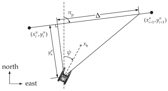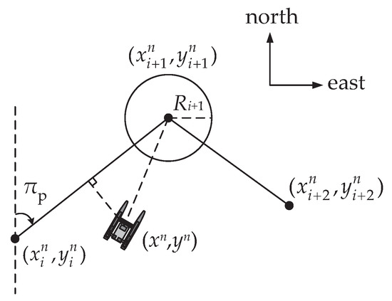where is the design parameter, is the angle between the expected straight path and north direction, is the cross-track error, and is the forward-looking distance, as shown in Figure 5.