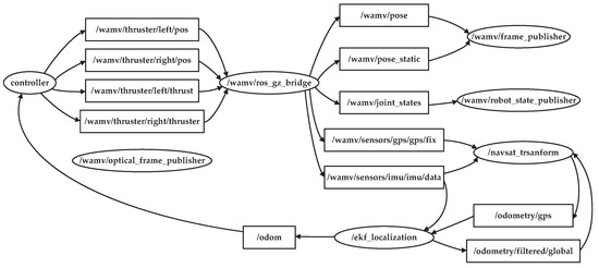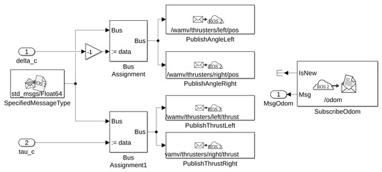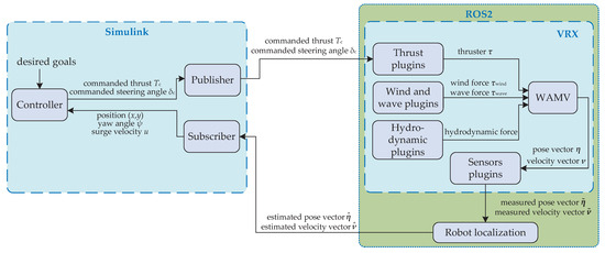 As shown in Figure 6, the controllers are implemented in Simulink. The controlled object (WAMV) and the motion state feedback are, respectively, implemented by VRX and “robot_localization” [18] in the ROS2 environment. The state estimation package “robot_localization” is used to estimate the motion status of WAMV, providing feedback signals for the controllers. We utilize the Publish and Subscribe modules of the ROS2 module group in the Simulink ROS toolbox to achieve communication between Simulink and VRX.