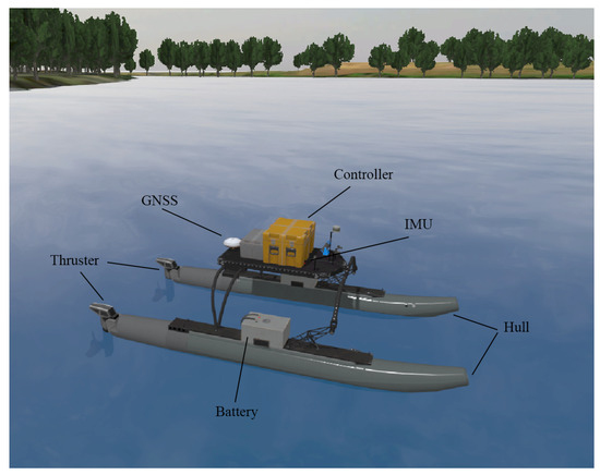 Unmanned surface vehicles (USVs), as unmanned platforms at sea, have been widely used in marine environmental surveys, maritime patrols, reconnaissance, and operations. For example, during the Russia–Ukraine conflict, Ukraine has heavily deployed USVs to carry out various combat missions such as reconnaissance, surveillance, and drone suicide attacks in the Black Sea, which has attracted widespread attention [1]. The design and validation of USV motion control algorithms require navigation tests. However, actual tests have low efficiency and high cost, and in complex sea conditions, the changes in USV model parameters and environmental disturbances pose challenges to the design and verification of motion control algorithms. Therefore, it is important to design simulation systems that are intuitive and realistic to quickly verify the USV motion control algorithms.