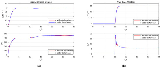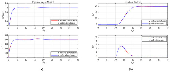 In the yaw rate control mode, the initial surge velocity and yaw rate are both 0. The surge velocity is set to 2 m/s and the yaw rate is set to 15°/s at 10 s. Figure 11a shows the variation curves of surge velocity and thrust, while Figure 11b shows the variation curves of yaw rate and azimuth angle. The red and blue lines correspond to the absence of wind and wave interference and the presence of wind and wave interference, respectively.